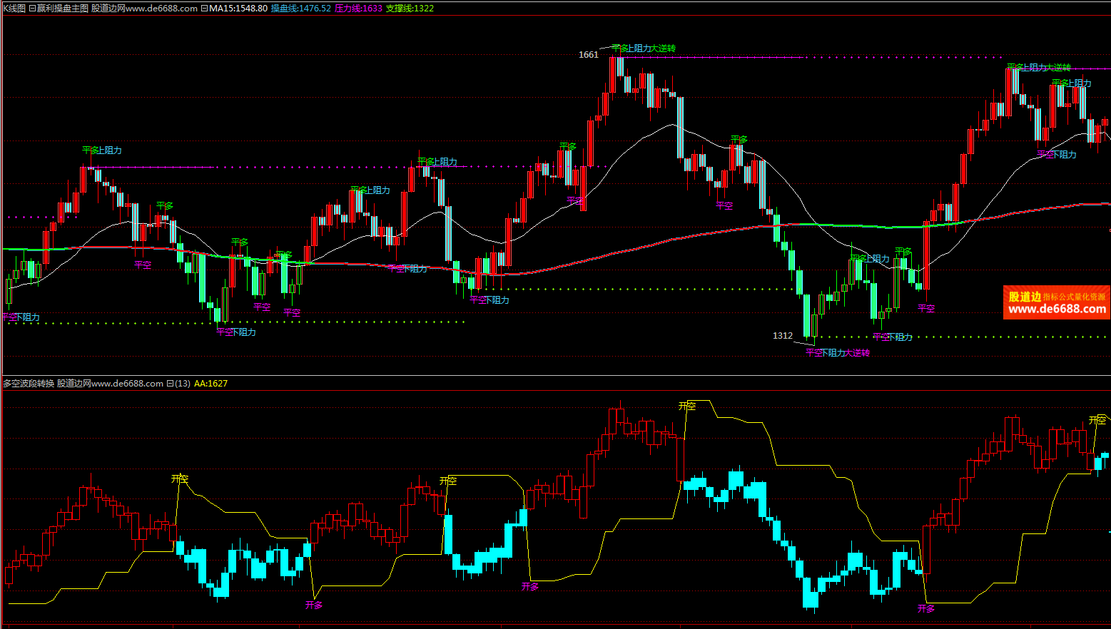 倚天财经软件 赢利操盘主图指标 支撑线 压力线 多空波段转换副图公式 开多开空提示 主附图源码