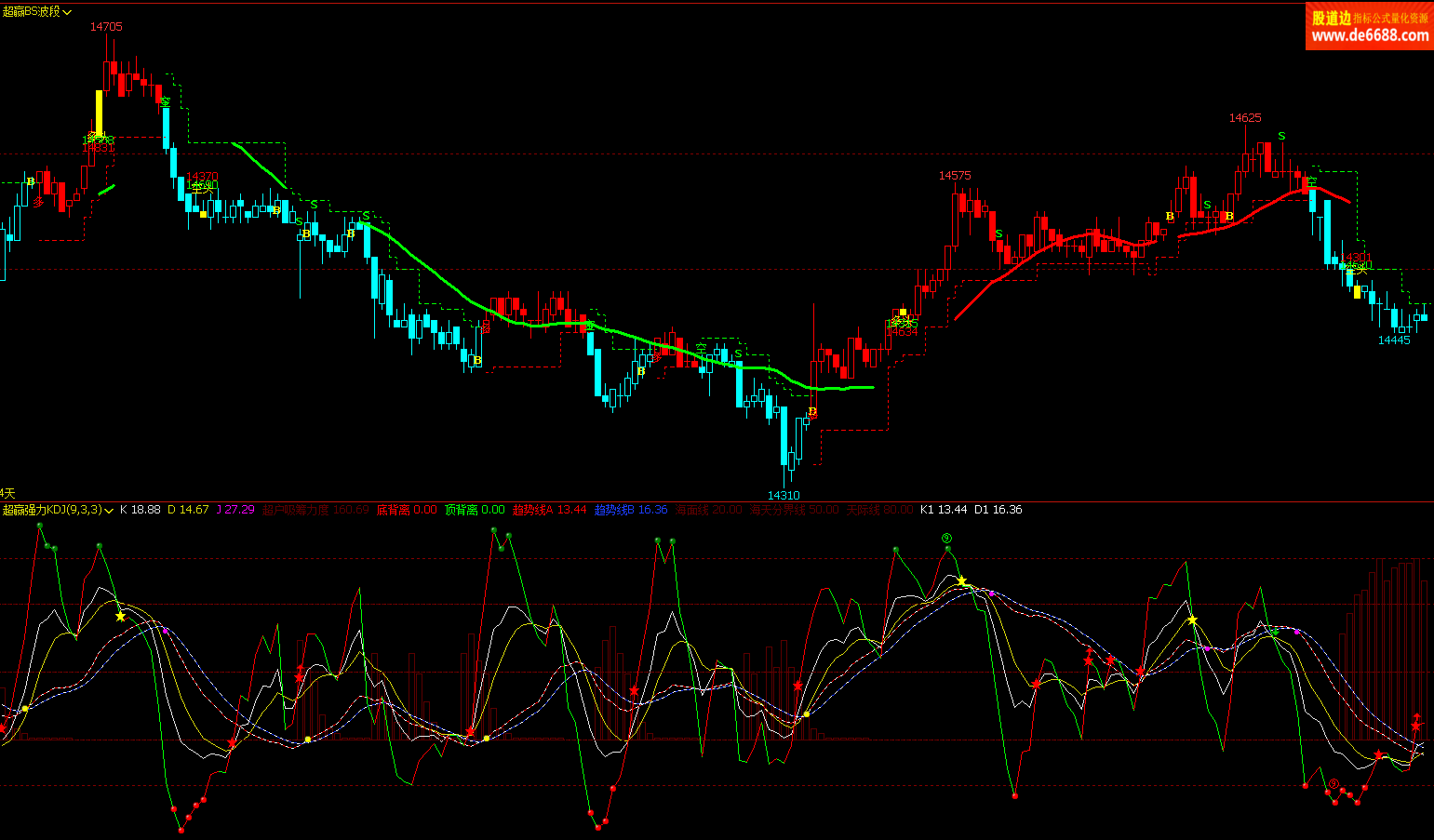 副图说明:此指标为文华财经WH6软件使用的副图指标, 超赢强力KDJ副图有超户吸筹力度,底背离,顶背离,趋势线,海面线,天际线等,无未来函数