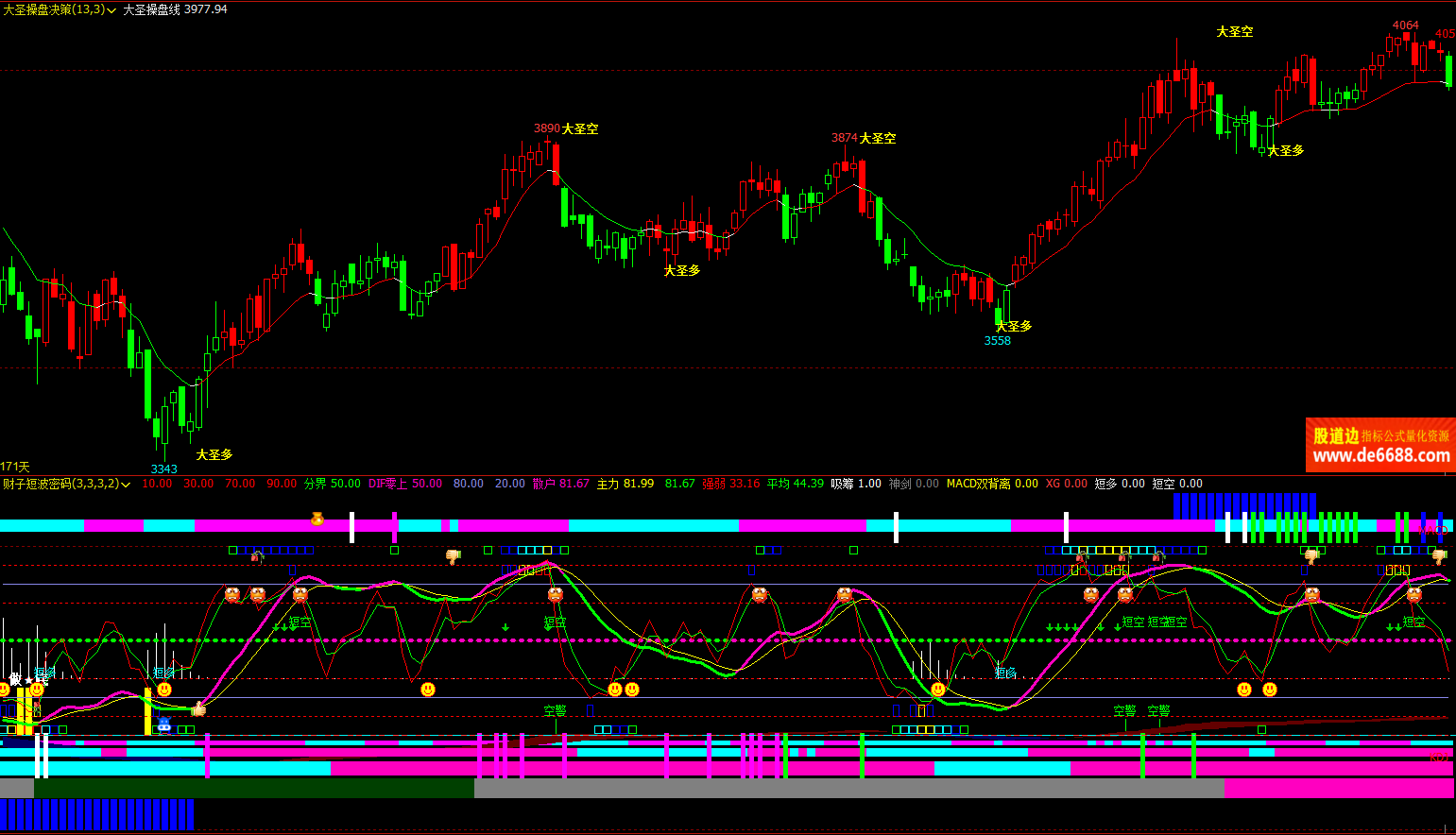 主图说明:此指标以大圣操盘线由绿变红做多买入,由红变绿做空卖 出, 有大圣多空文字提示,无未来