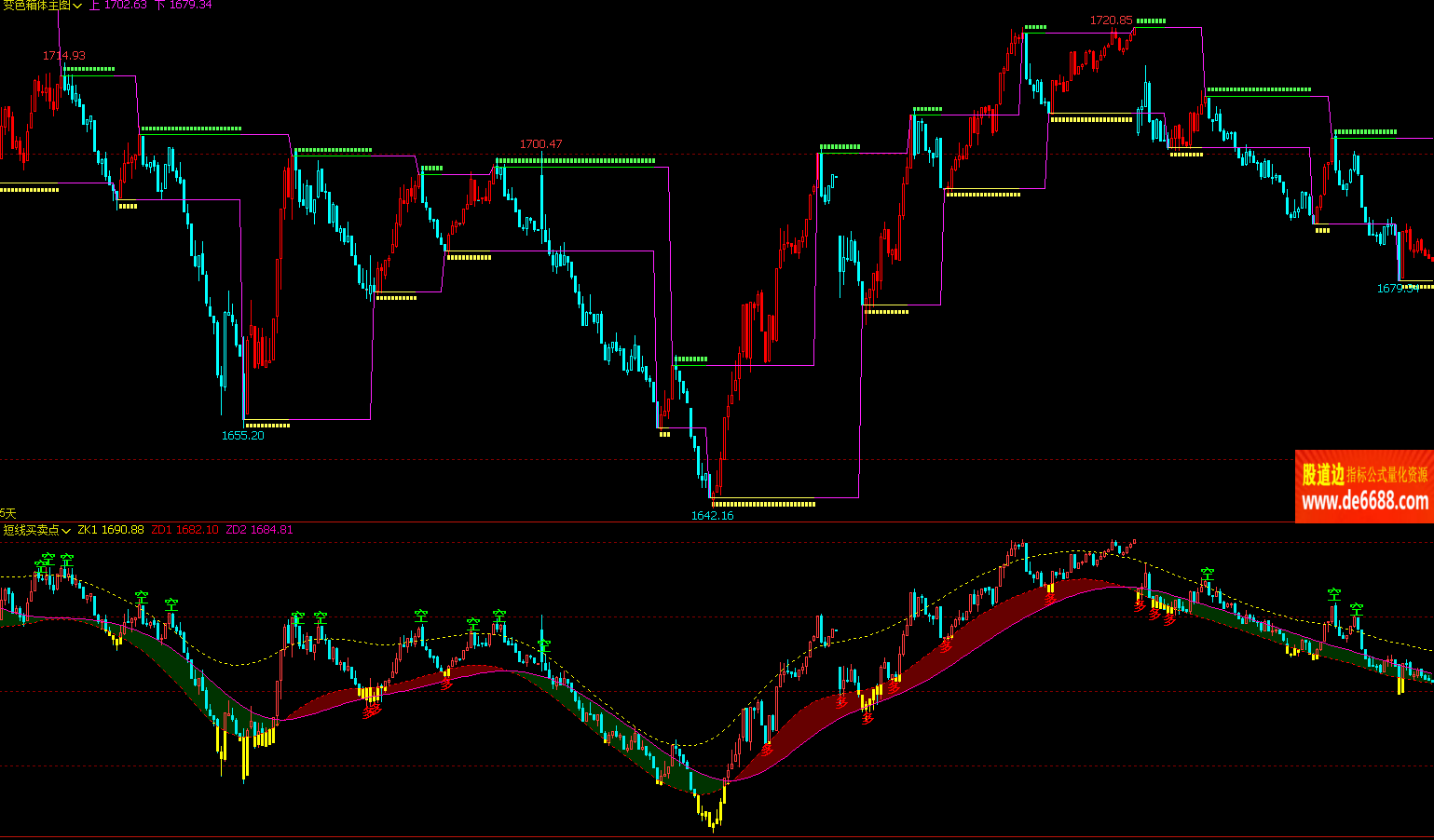 主图说明:此指标为箱体通道指标,波峰波谷,上轨下轨,价大于下轨,K线变红,价小于上轨,K线变绿。