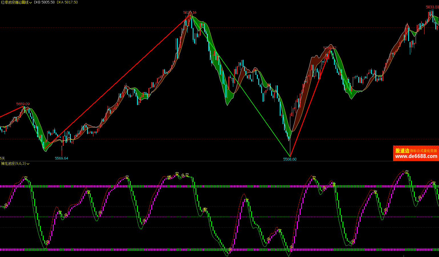 • 文华财经WH6 红绿波段缠论画线主图指标 神龙波段副图公式 多空短线 主附图源码