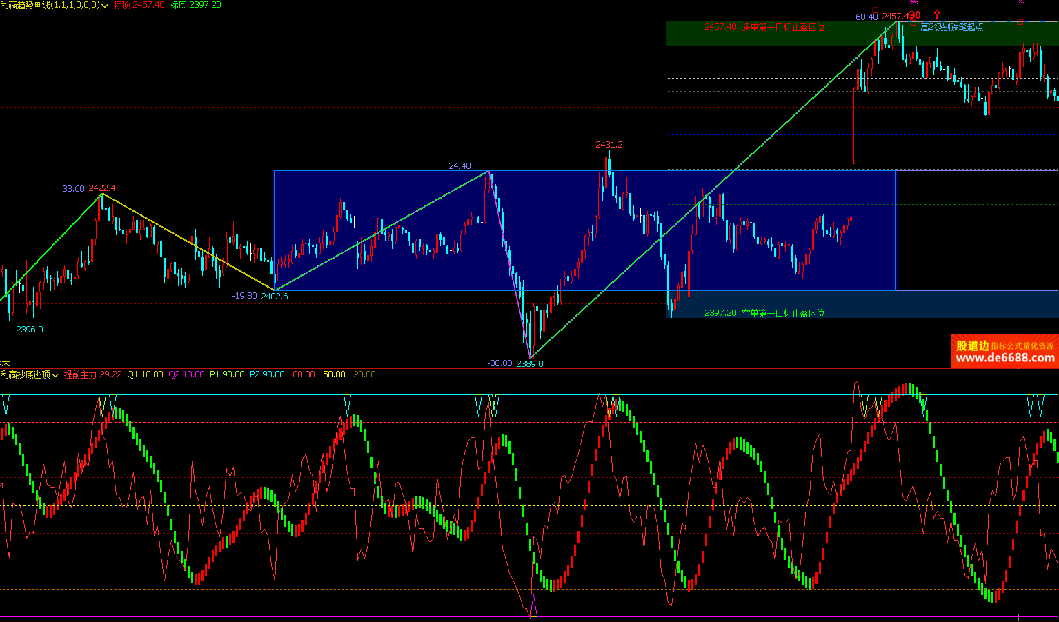 副图说明:此指标为文华财经WH6 软件使用的副图指标,利赢抄底逃顶副图有提前主力线,变色操盘带,顶部提示,底部提示,底部区域绿变红可做多加仓,顶部区红转绿做空逃顶,无未来函数