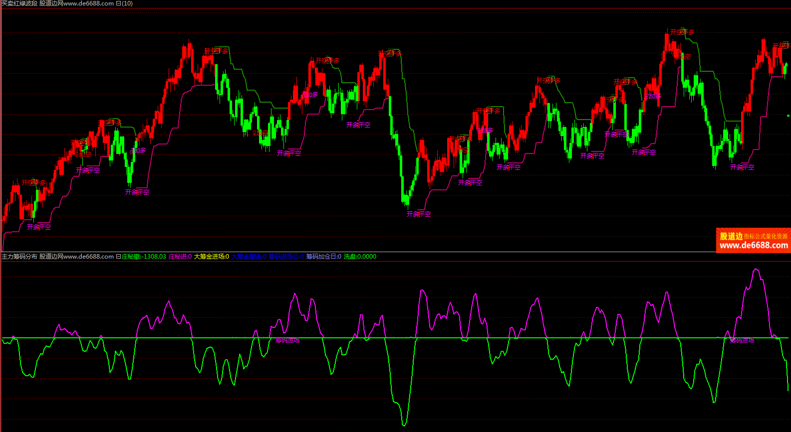 主图说明:此指标为倚天财经软件使用的主图指标,买卖红绿波段主图有变色K线,红多绿空,有开空平多,开多平空等文字提示,无未来函数