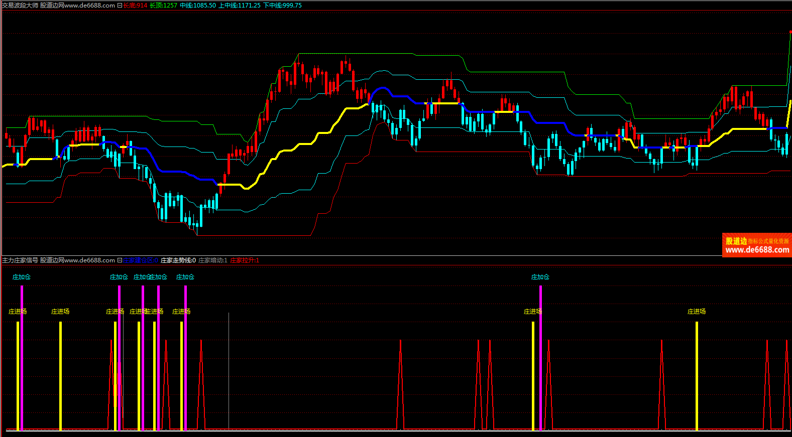倚天财经软件 交易波段大师主图指标 黄蓝通道 主力庄家信号副图公式 建仓拉升提示 主附图源码
