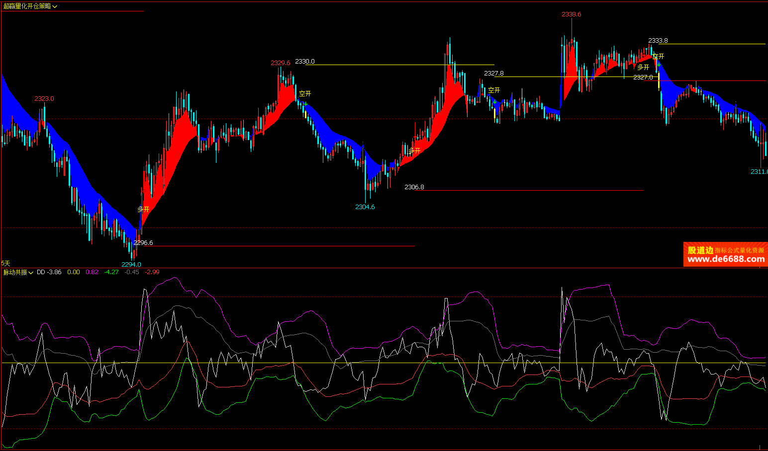文华财经WH6 超赢量化开仓策略主图指标 脉动共振副图公式 脉动趋势线 主附图源码