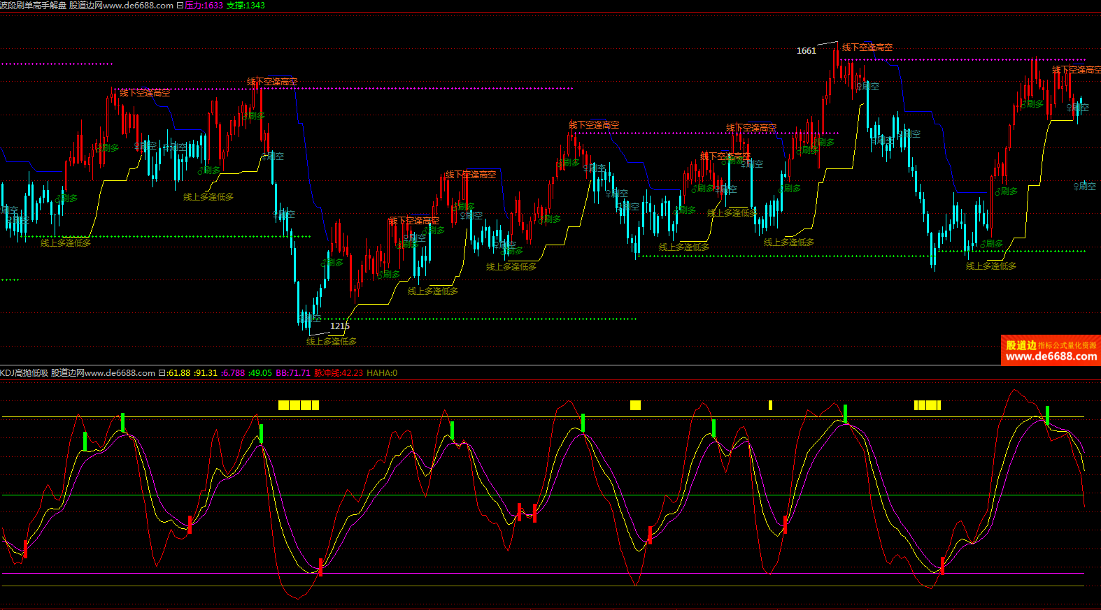 倚天财经软件 波段刷单高手解盘主图指标 多空支撑线 KDJ高抛低吸副图公式 主附图源码