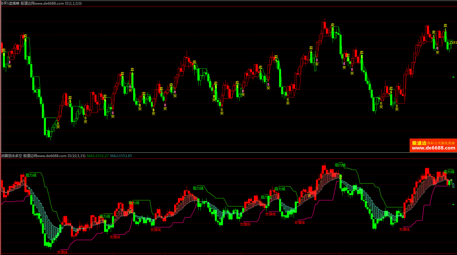 倚天财经软件 B买S卖策略主图指标 BS点提示 启赢狙击多空副图公式 阻力支撑线 主附图源码