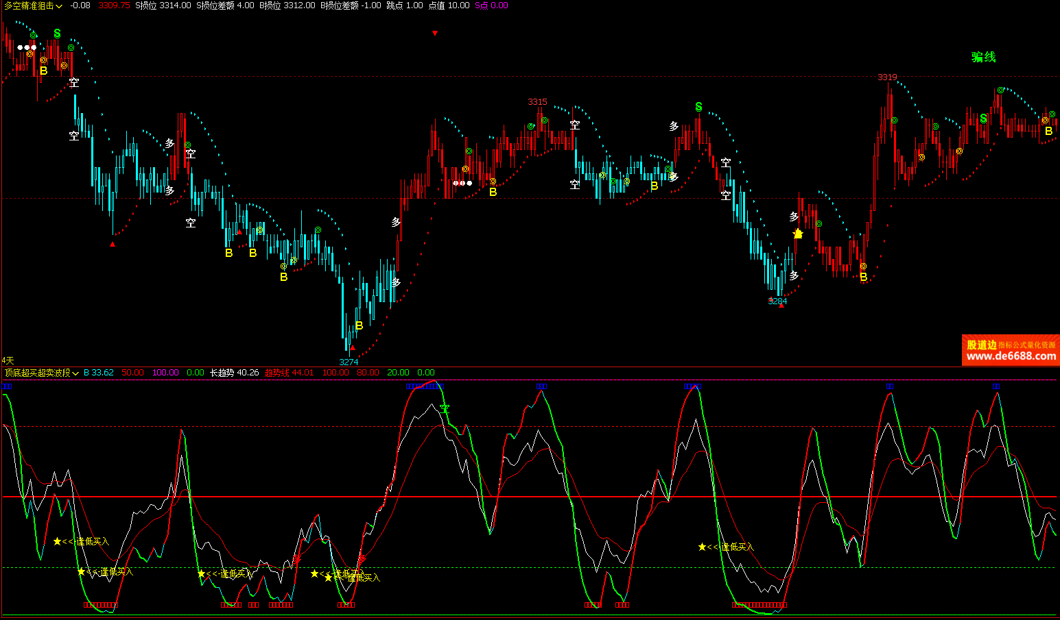 主图说明:此指标为文华财经WH6 软件使用的主图指标,多空精准狙击主图有多空线,变色K线,有多,空,B,S点等文字或图标提示