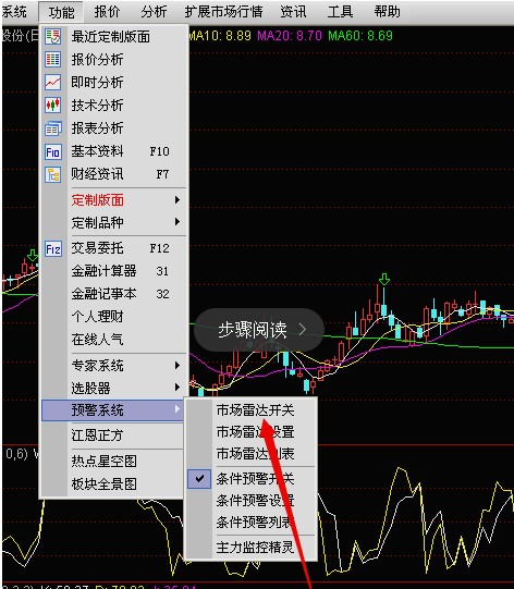 首先我们需要打开市场雷达的选项,从而使雷达开启,有雷达帮助我们进行分析预警。而后我们队市场雷达进行相应的设置,从而市场上一旦有风吹草动,我们能够立马进行相应的操作。相应的操作如图所示。